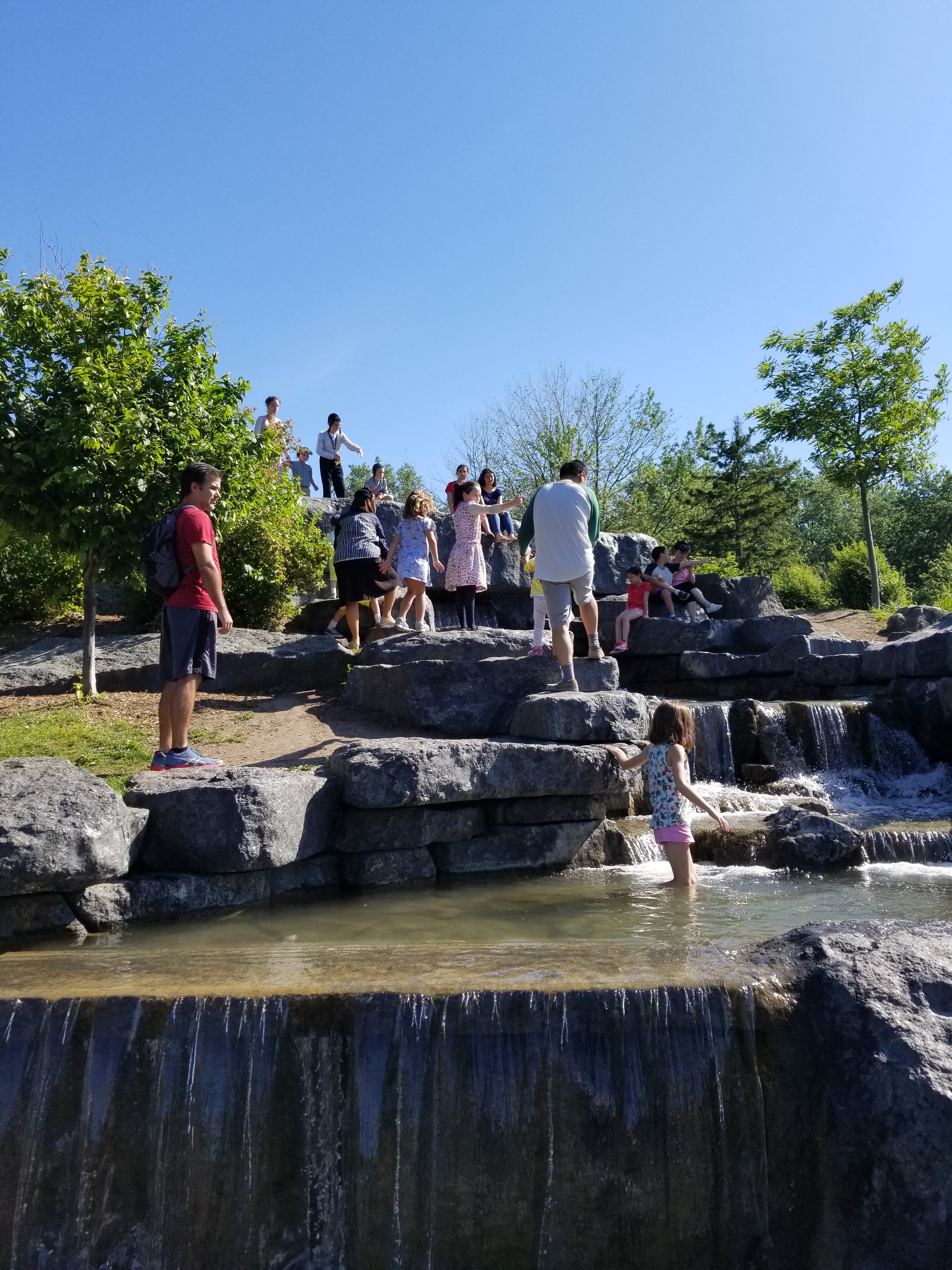 There were a lot of people climbing the waterfall and kids playing in the water.